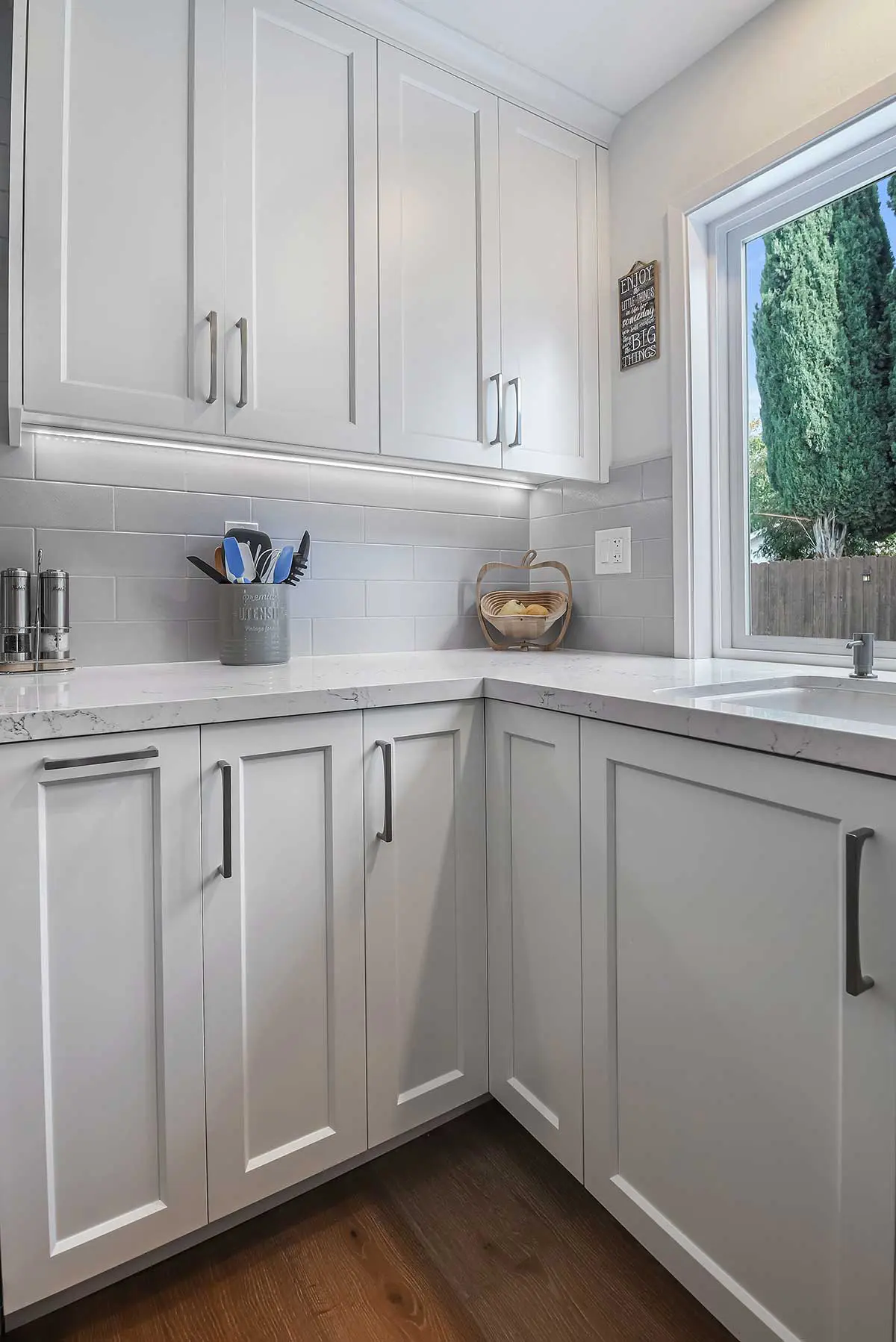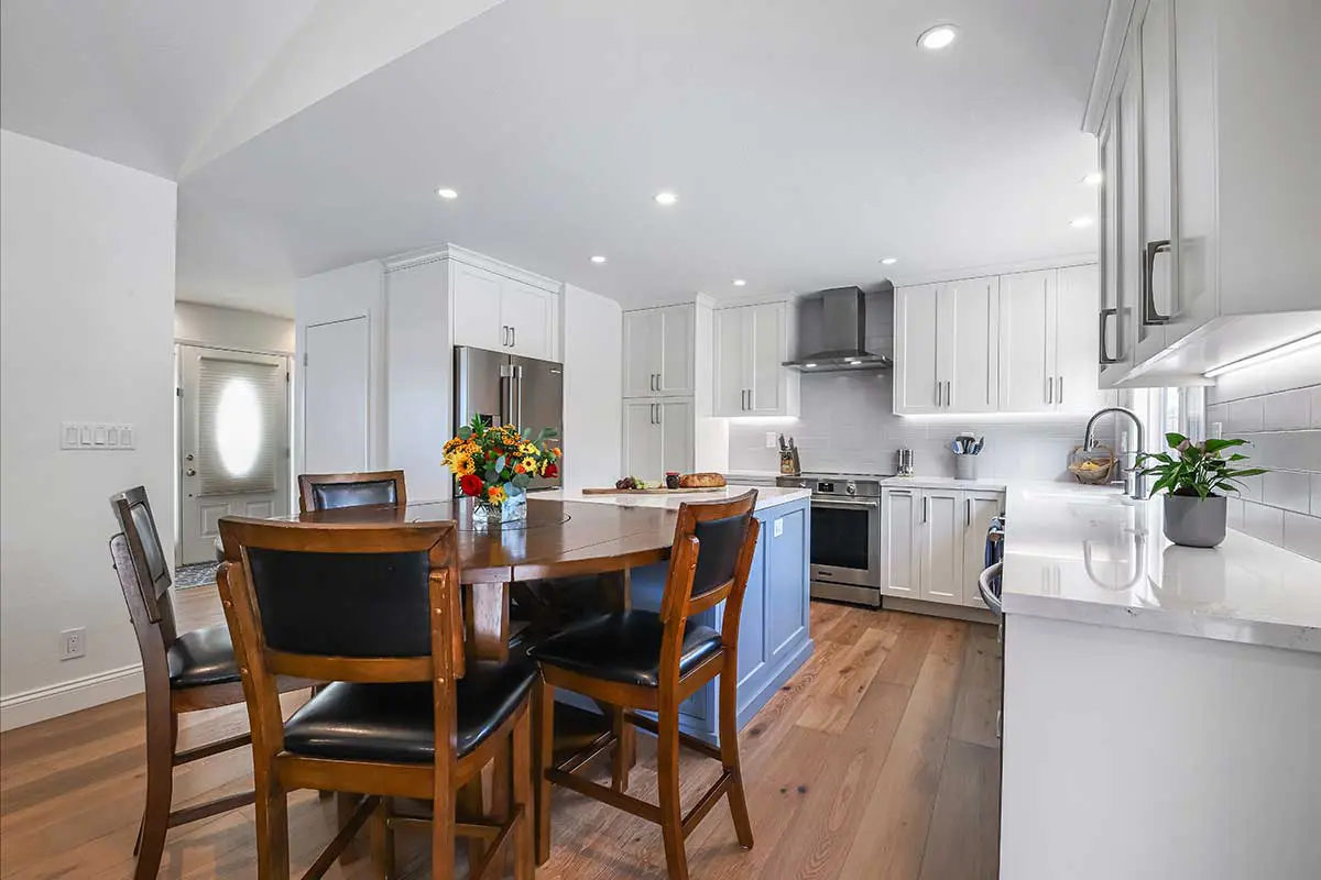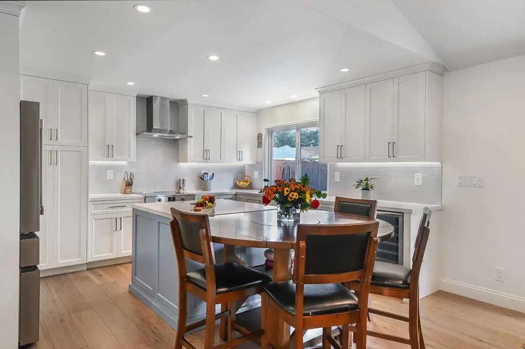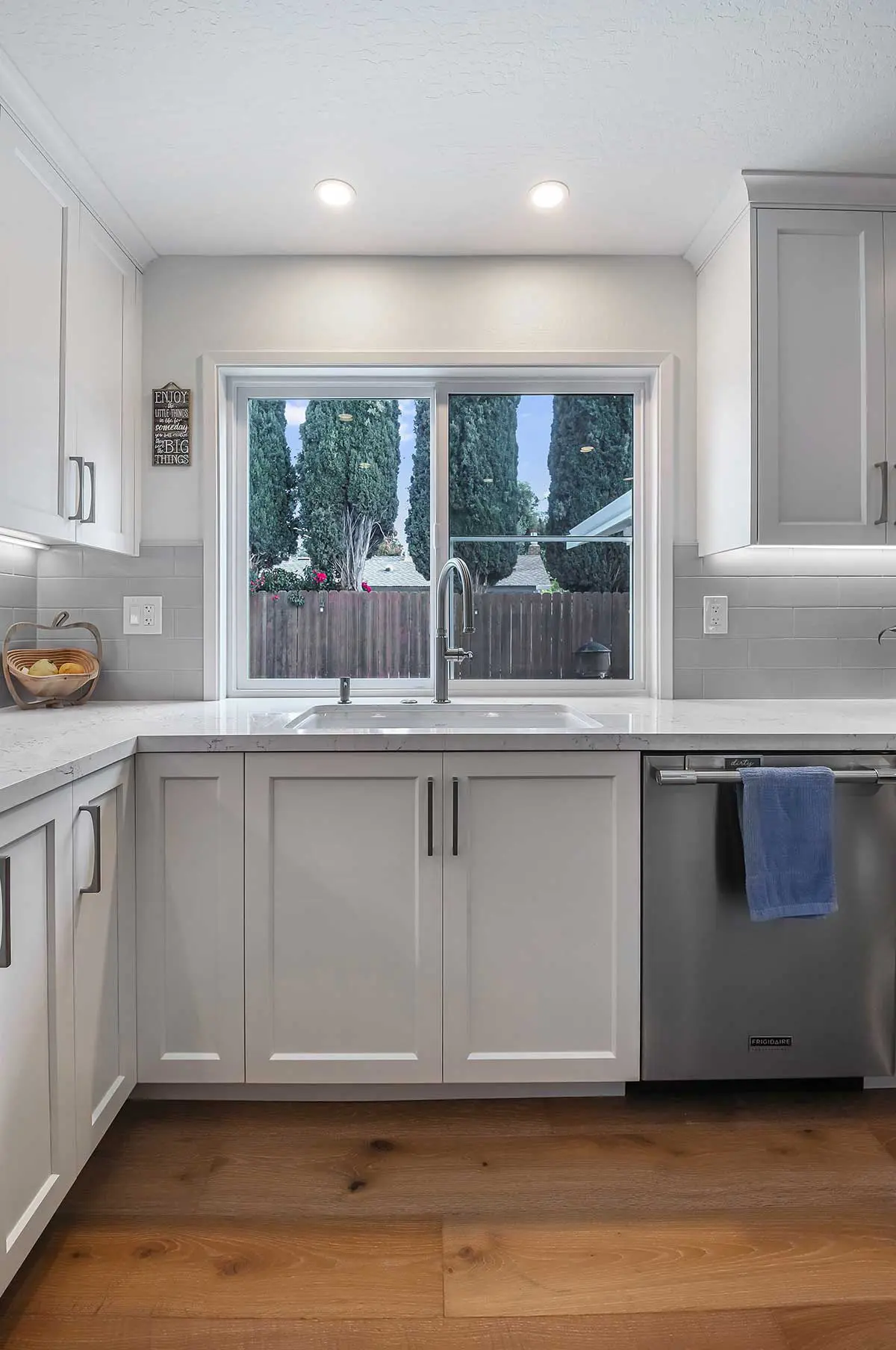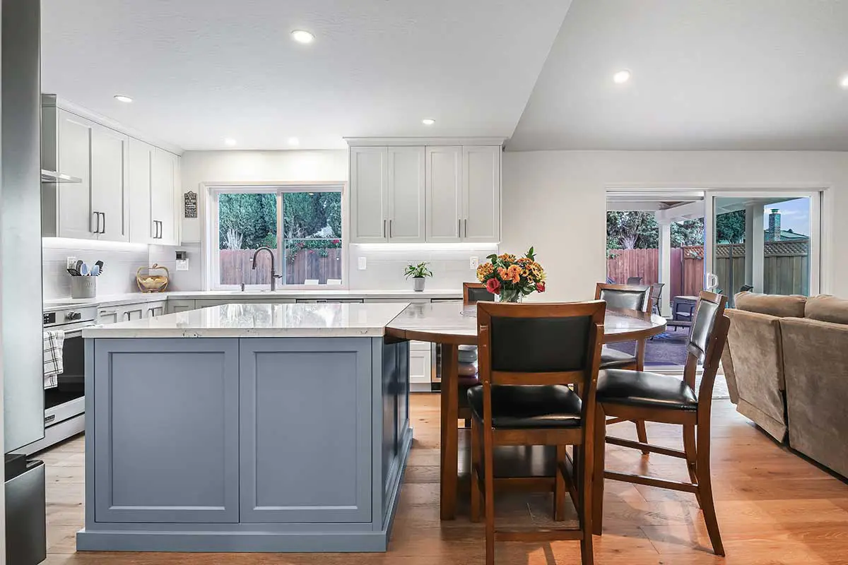 These Livermore homeowners were ready to give their dated kitchen and living areas a fresh, modern feel. They wanted to replace the old fluorescent lighting, brighten the space, and make it more functional with new cabinetry and custom storage solutions. One major priority was addressing the uneven floor between rooms—raising the dropped floor to make all areas the same level, eliminating a tripping hazard and improving the overall flow of the home.