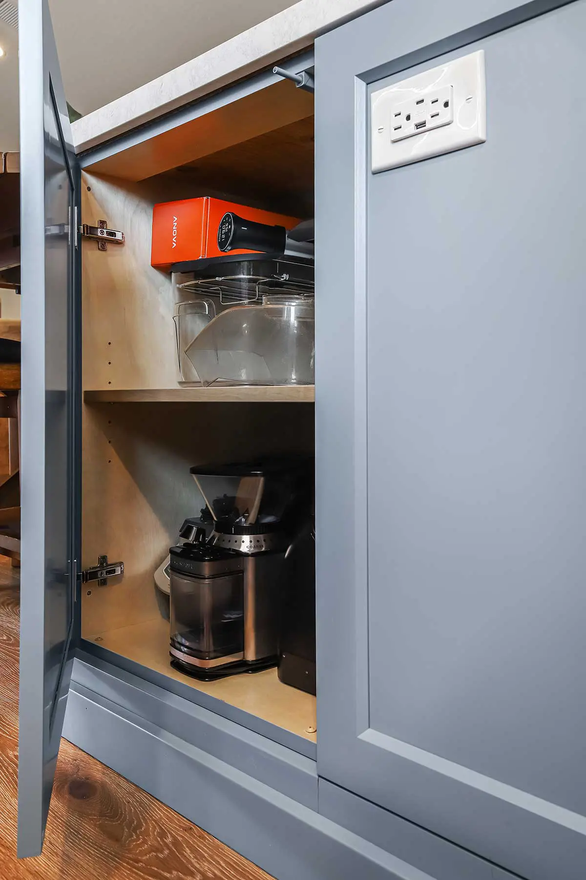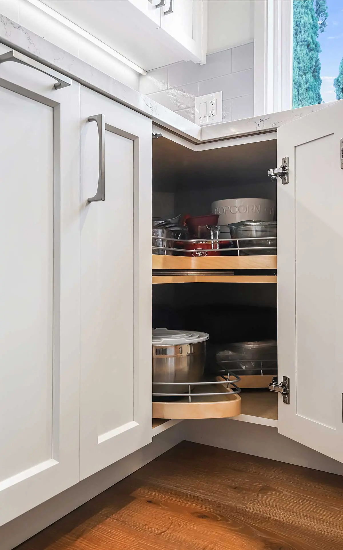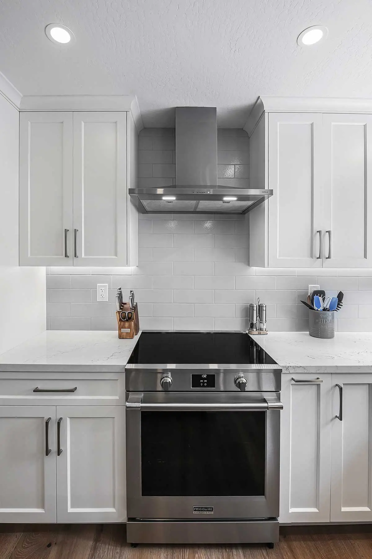 To bring the homeowners’ vision to life, our design-build team reimagined the main living areas with an open, cohesive layout and a lighter, more contemporary aesthetic. Because the kitchen offered a modest footprint, we focused on smart space planning—adding interior storage conveniences like roll-outs and semi-custom cabinetry to maximize every inch. We also removed an extra, unnecessary exterior door to free up valuable wall space for cabinetry and improve functionality—an inventive solution that made the compact kitchen feel larger and more efficient.