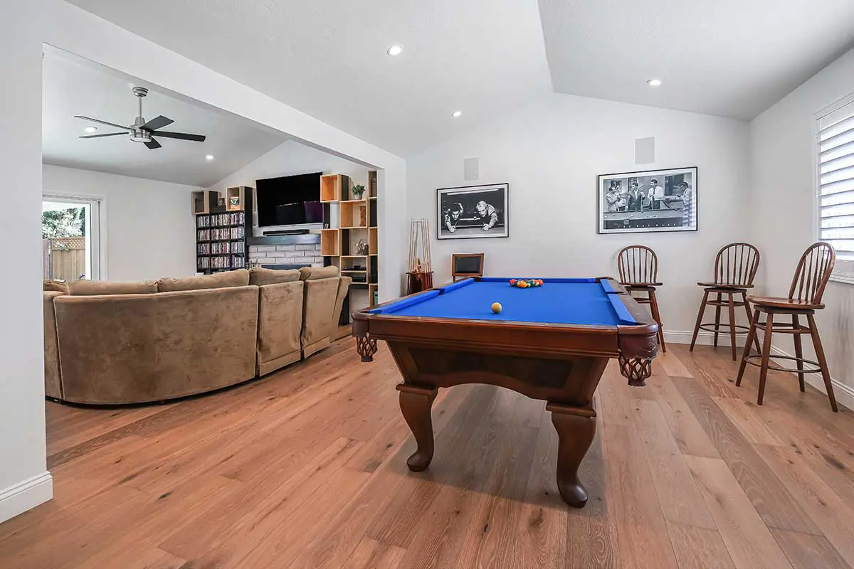 Walls separating the kitchen, family room, and pool room were removed to create a seamless connection for daily living and entertaining. Outside, the new pavilion provides much-needed shade near the pool—keeping the interior cooler and offering a comfortable escape from the Livermore summer sun. The result is a seamless transition between indoor comfort and outdoor relaxation, perfectly suited for the way the homeowners live and entertain.