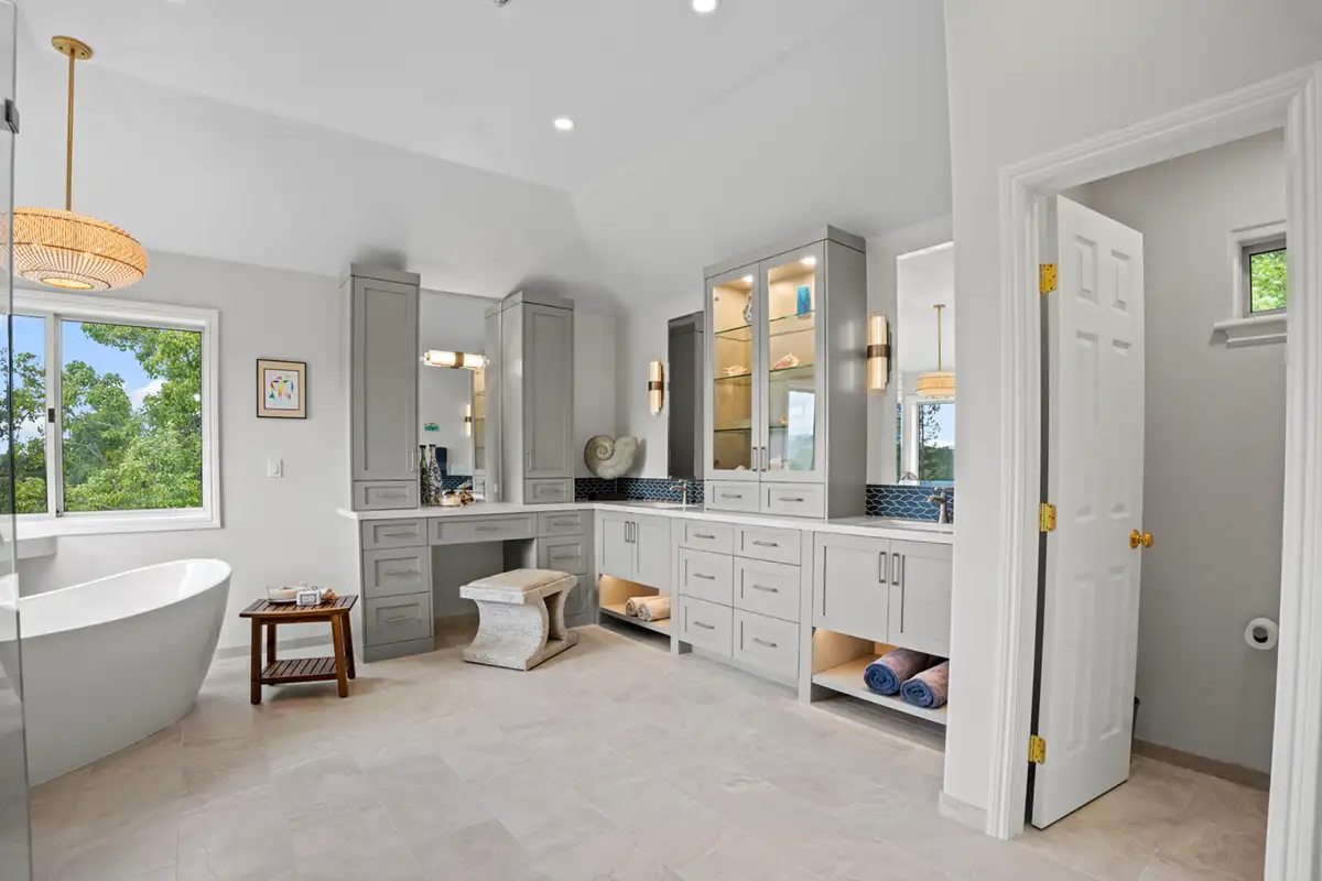 After a successful prior remodeling project which included extensive decking and doors, these returning clients entrusted Gayler Design Build once again to transform an expansive primary bathroom into a cohesive, calming retreat.