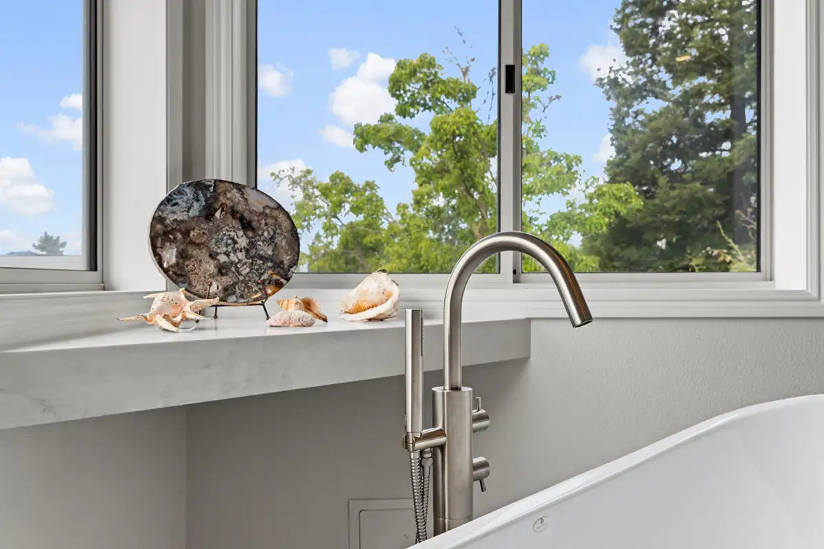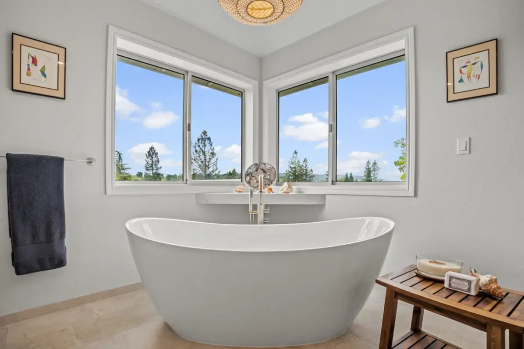 A freestanding Neptune tub serves as a sculptural focal point, offering both comfort and visual elegance. Its soft, flowing lines are paired with a streamlined tub filler, creating a quiet moment of relaxation within the space.