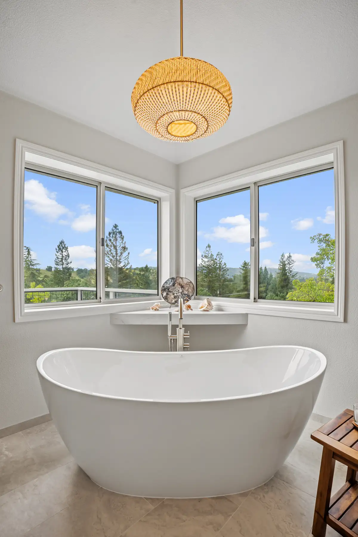 Above, a woven rattan light fixture adds warmth and an organic element, reinforcing the connection to the coastal inspiration.