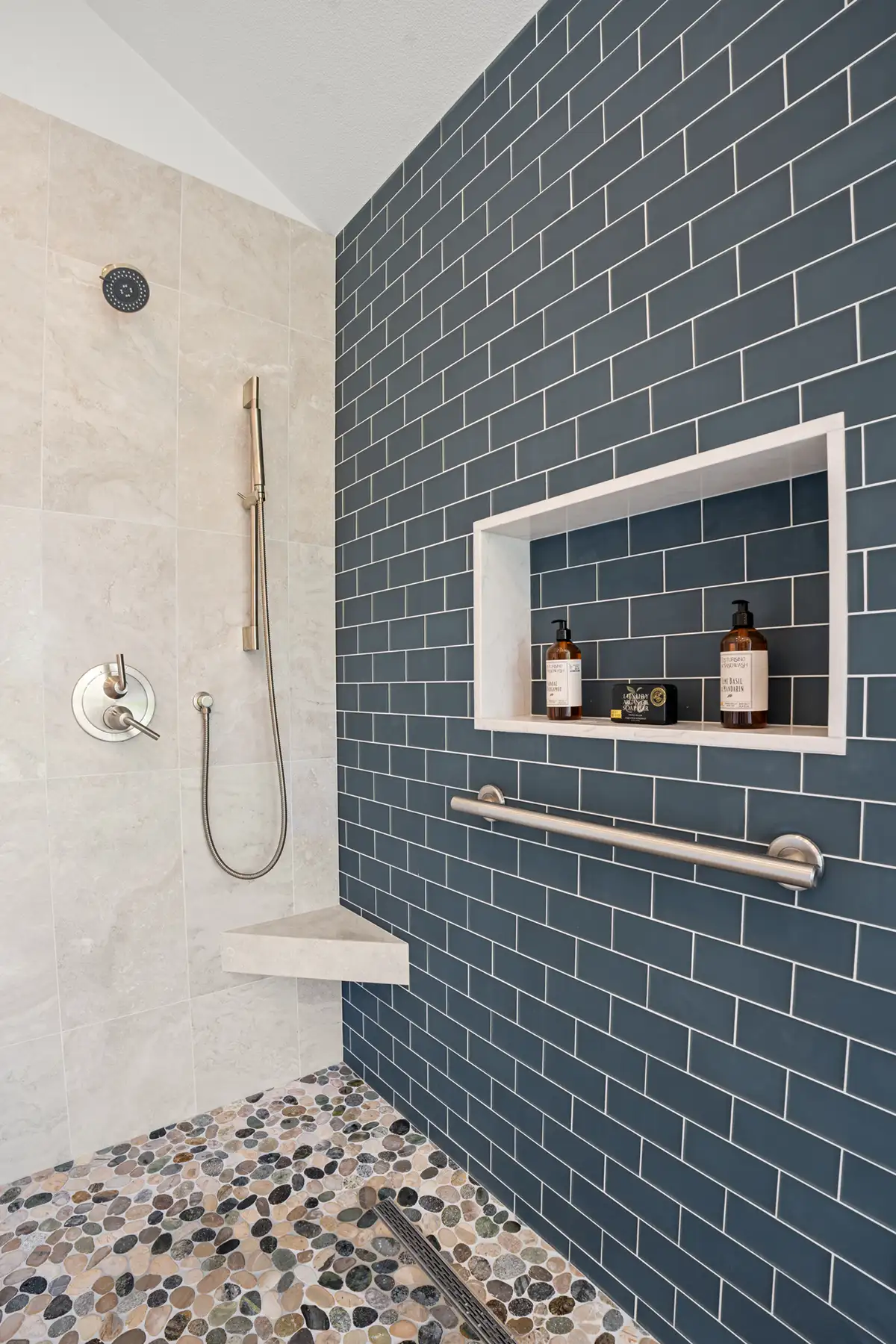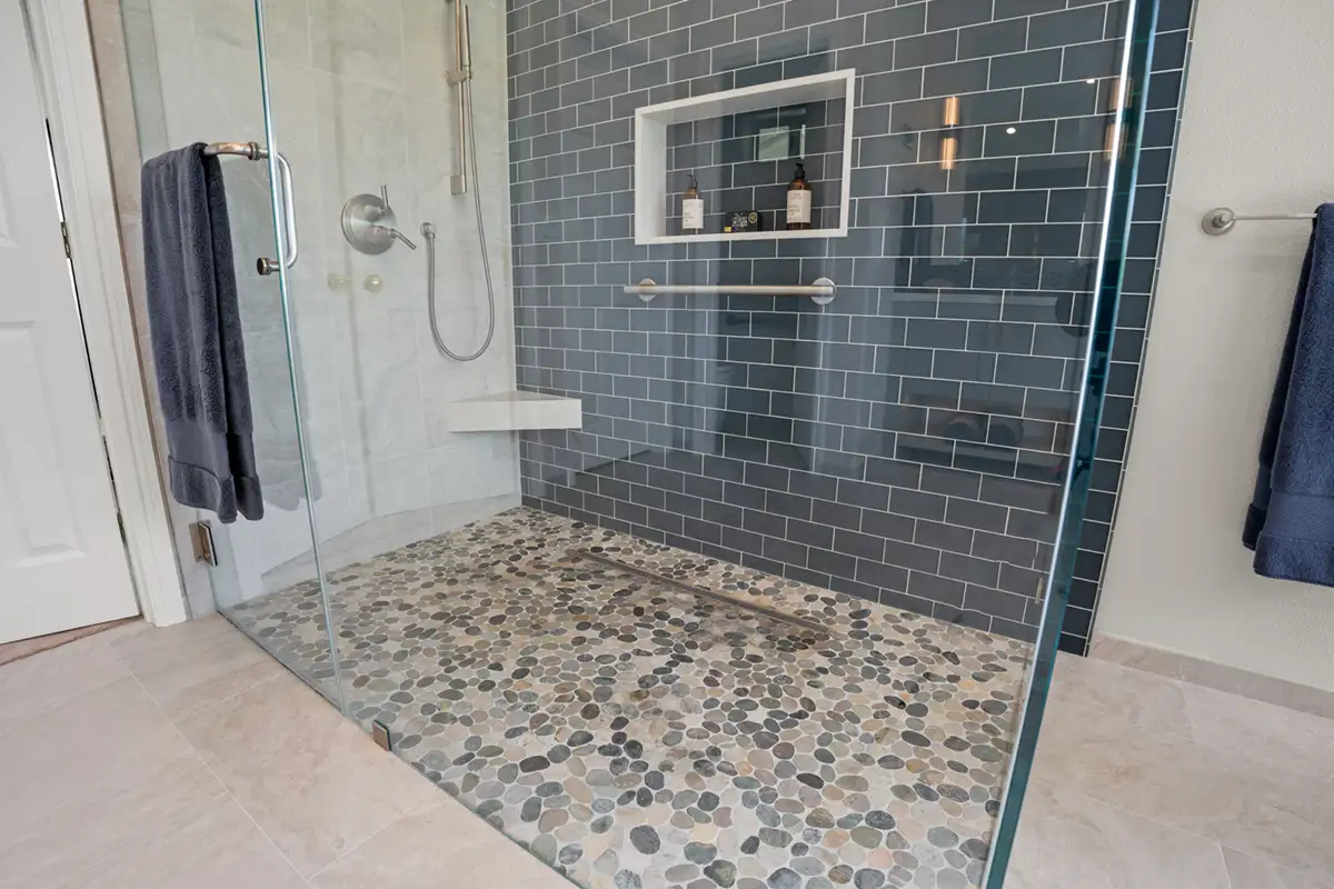 A pebble stone shower floor adds natural texture underfoot, while brushed nickel fixtures complement the palette and enhance the spa-like feel.