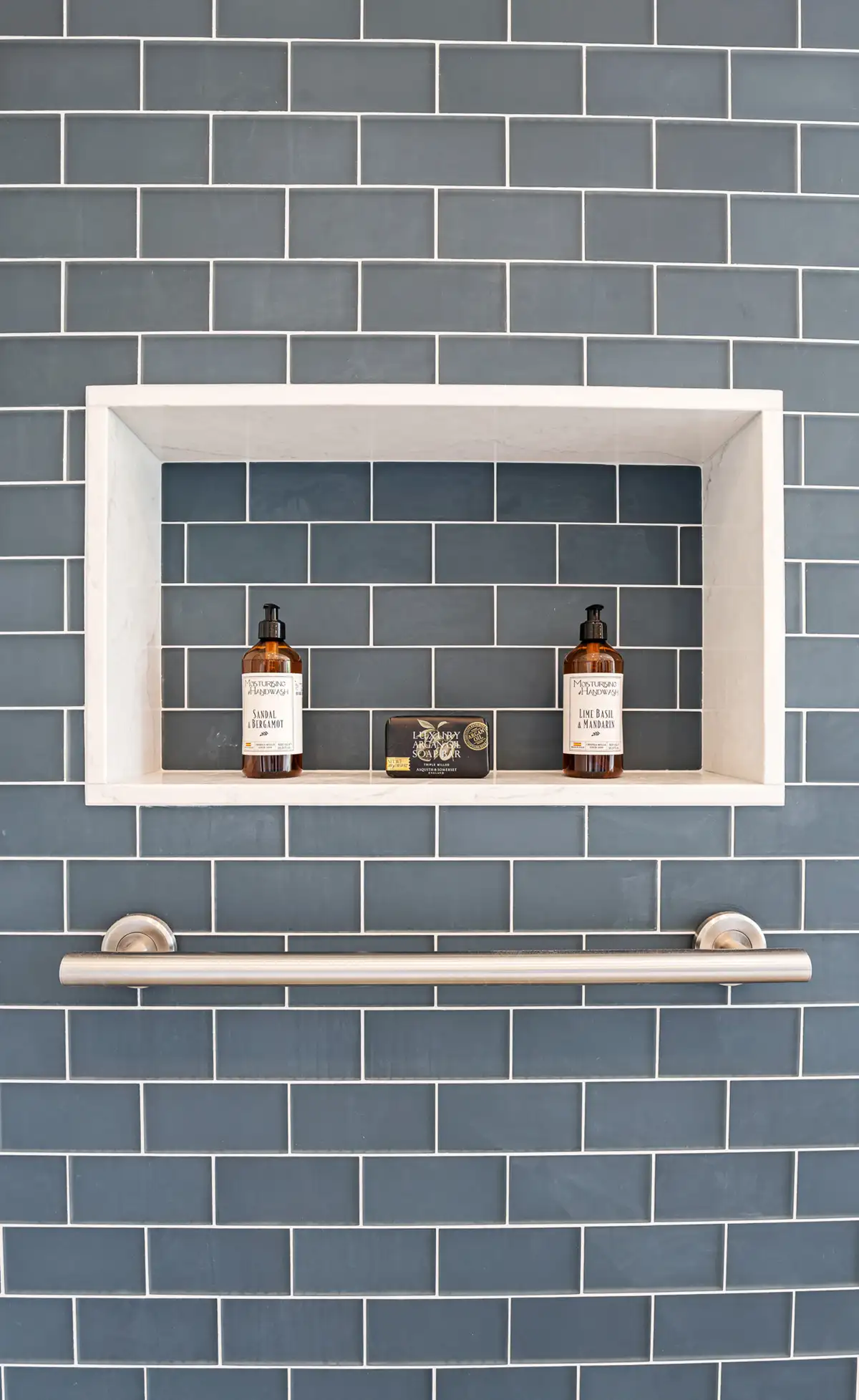 The oversized curbless shower, designed for aging in place, is anchored by a striking feature wall of Jeffrey Court 3×6 Reef Oceania matte glass tile, introducing color, texture, and a subtle coastal influence. Surrounding walls and flooring transition seamlessly with large-format porcelain tile in a soft greige tone, creating a calm, cohesive backdrop. Thoughtfully integrated grab bars provide added safety while maintaining the overall aesthetic.