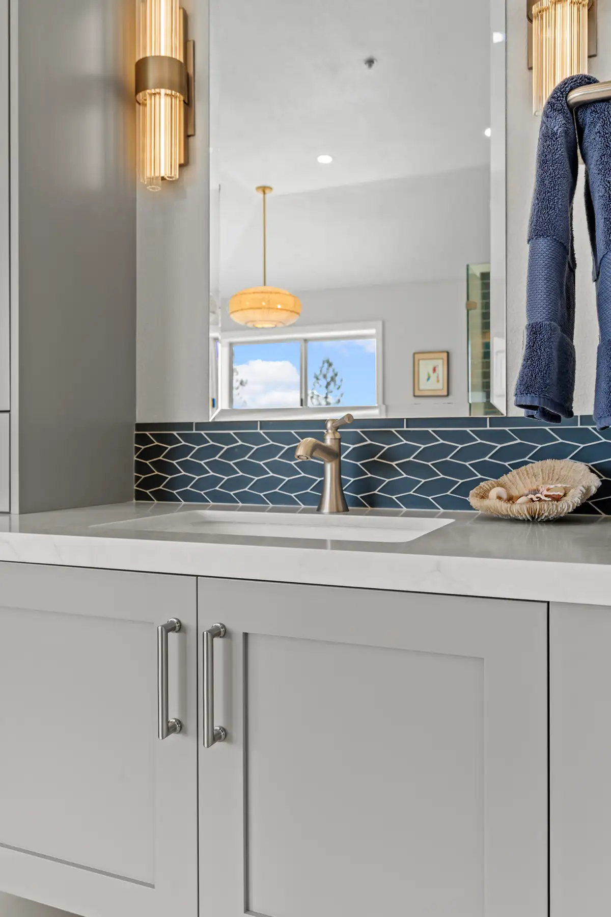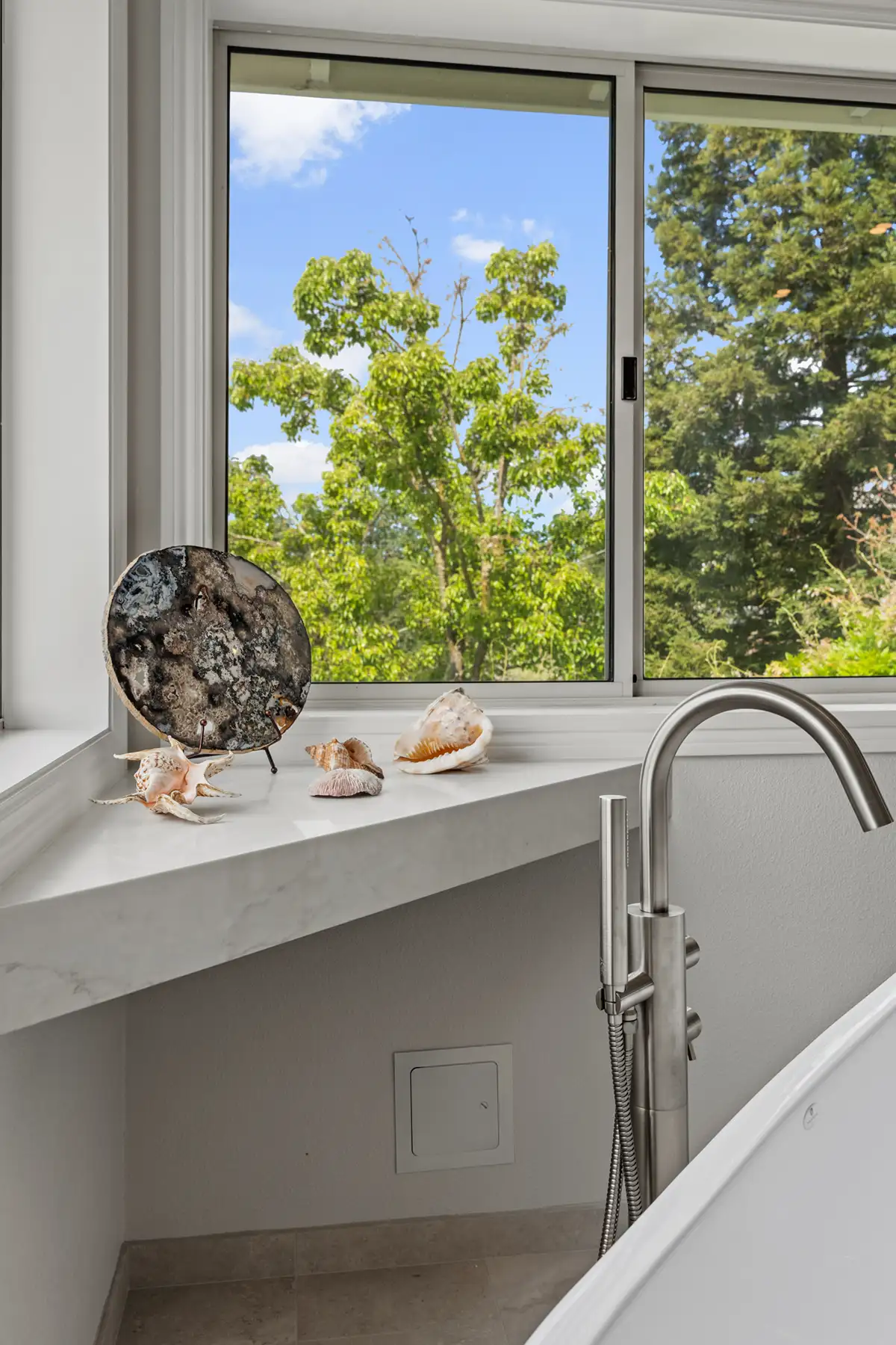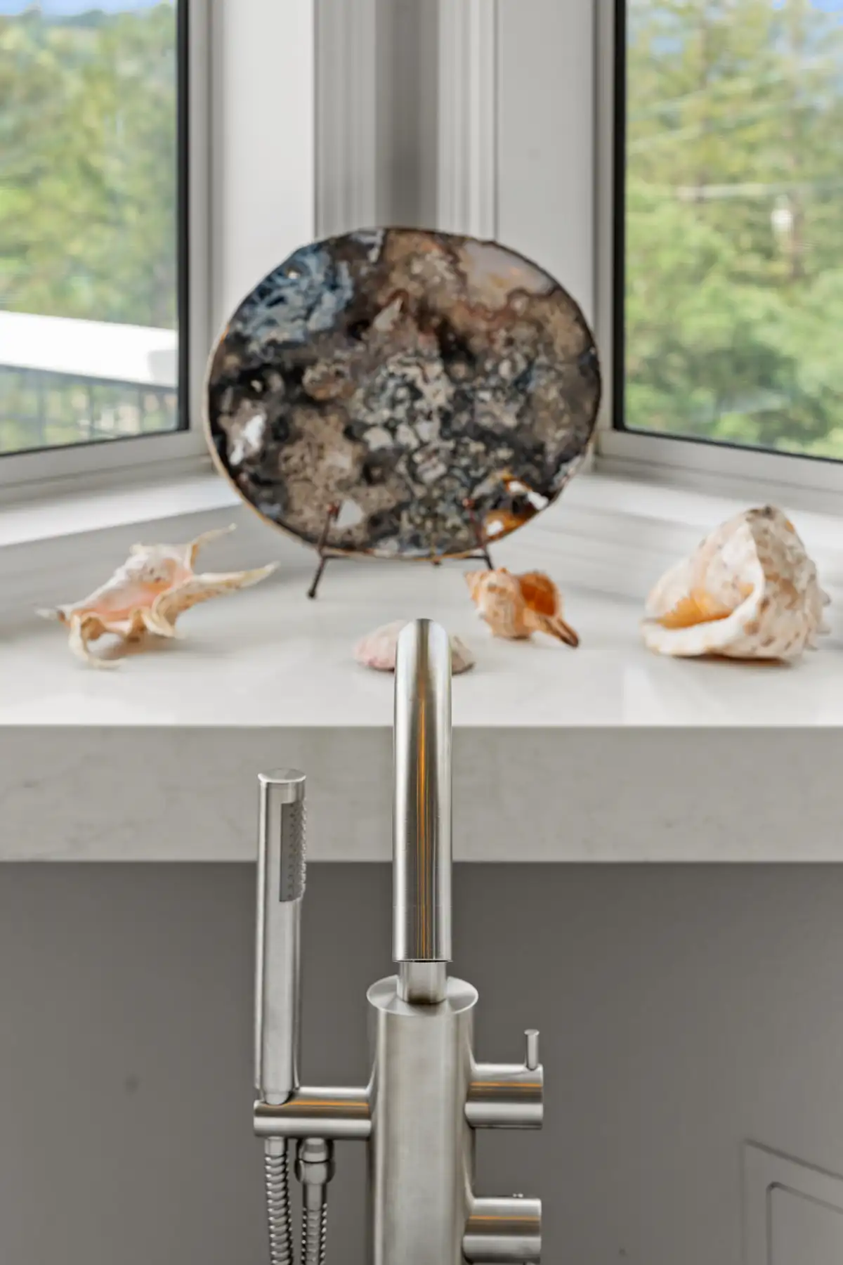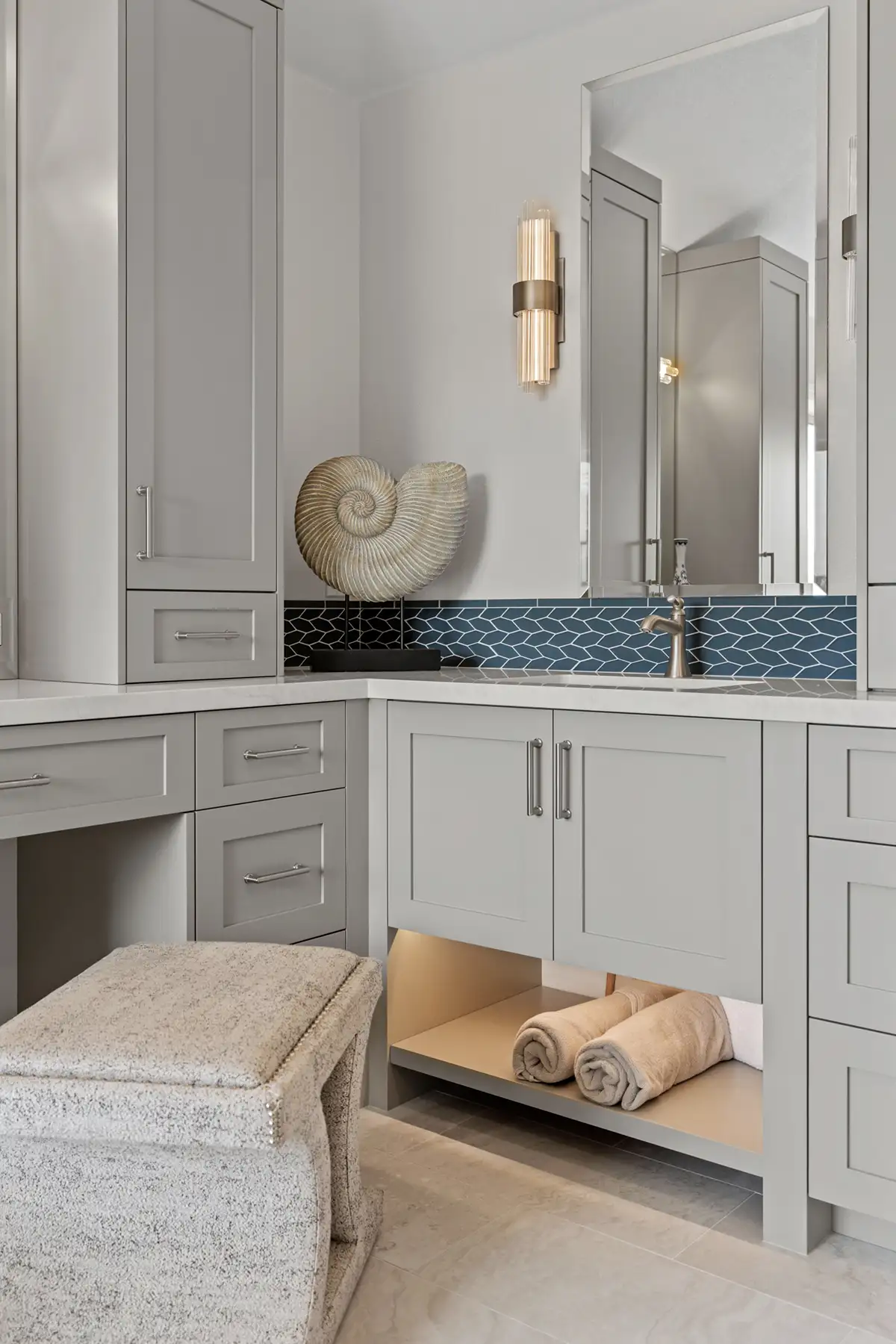 To further personalize the space, a custom corner shelf was crafted from the same Sereno Blanco quartz countertop, creating a seamless display area for the homeowners’ curated seashell collection.