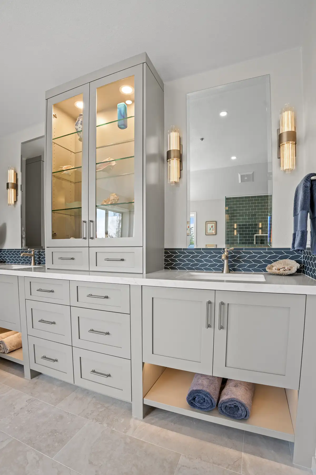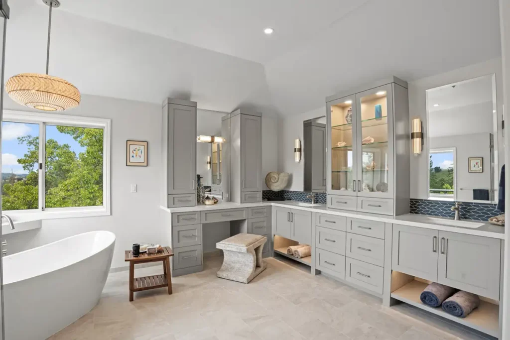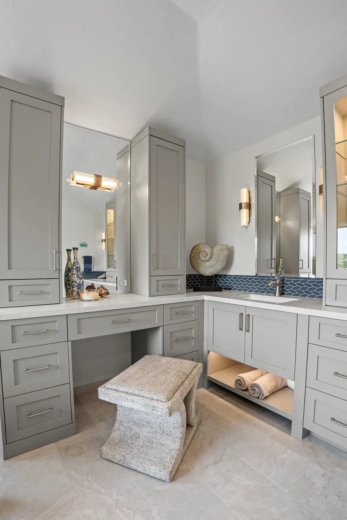 Custom cabinetry was designed to anchor the space and maximize functionality. A central linen and display cabinet creates a focal point along the primary vanity wall, while a dedicated makeup area with tall pier cabinets on the opposite wall adds balance and usability. Finished in a rich Cape May Cobblestone tone, and topped with a beautiful Sereno Blanco quartz countertop, the cabinetry introduces depth and warmth.
